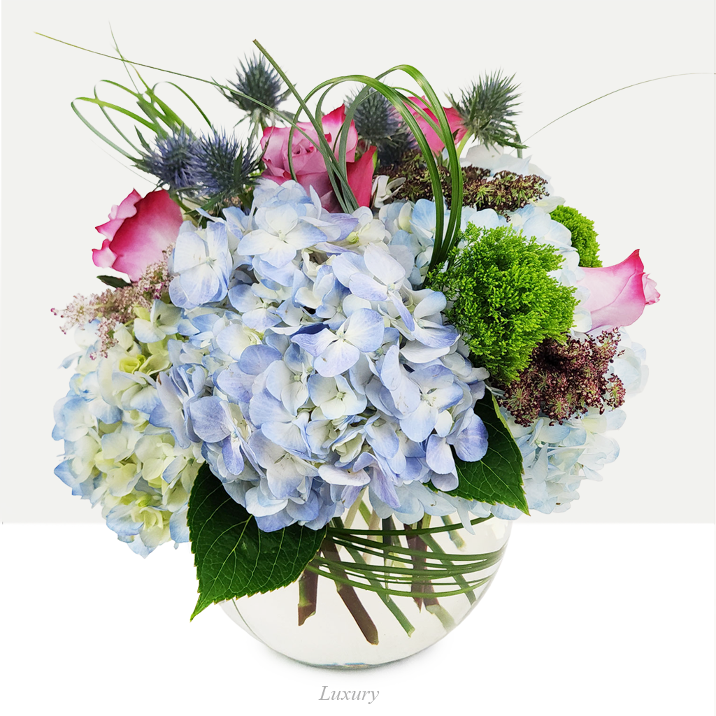 Pinnacle Blue is a fun yet romantic arrangement in a circle glass vase that is sure to wow and impress. Hydrangea, roses and an assortment of fun greens make up this stunning arrangement.