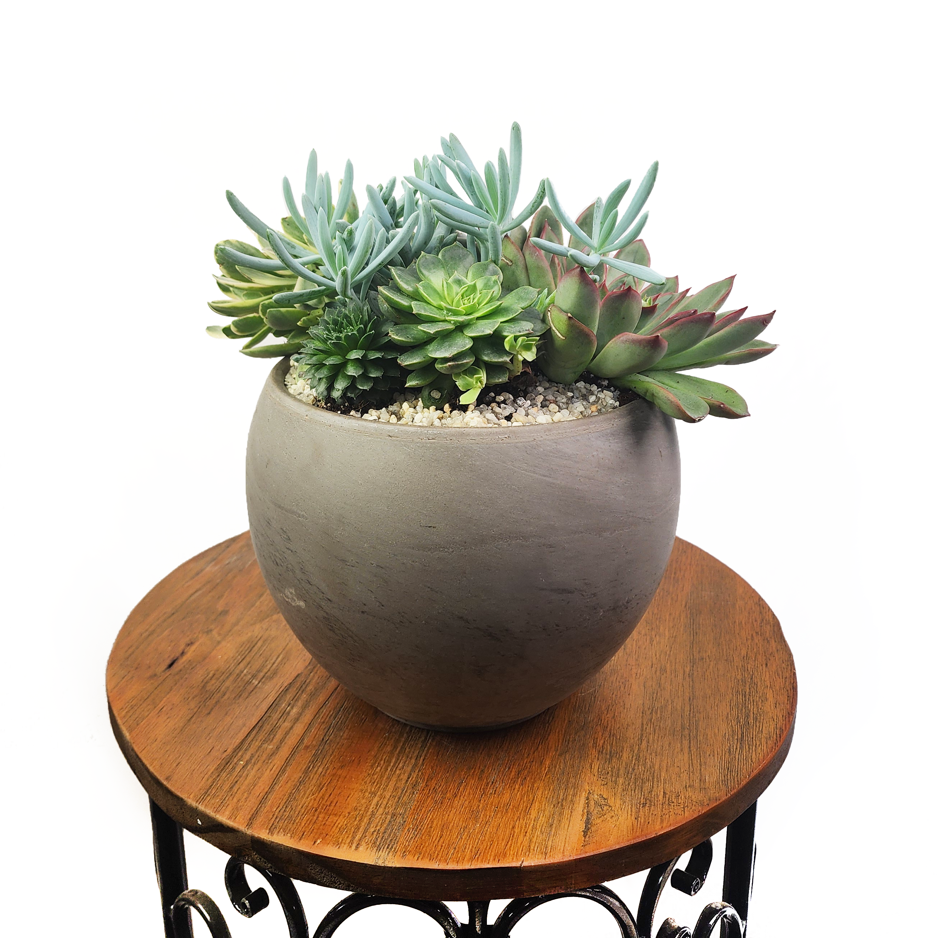 This charming houseplant garden features an assortment of vibrant succulents nestled together in a smooth, round ceramic container. The variety of shapes, colors, and textures—create a harmonious, low-maintenance display. The sleek, neutral ceramic pot complements the natural beauty of the plants, making it a perfect addition to any space in need of a touch of greenery. The compact design allows for easy placement on shelves, tabletops, or windowsills, adding life and color to any room.