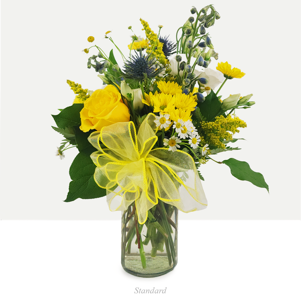 Bring a smile to anyone’s face with the Gleeful Journey. This bouquet contains stunning white daisy mums, thistle, and waxflower, making it a long lasting arrangement.