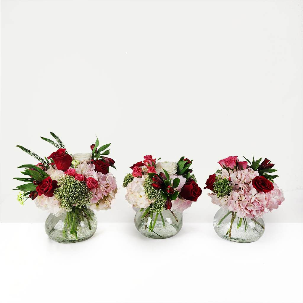 The Marion features pink hydrangea accented with a red rose, pink spray roses, and other seasonal blooms, arranged in a Rosie Posie vase. Sweet and timeless, this arrangement captures the beauty of love in full bloom.