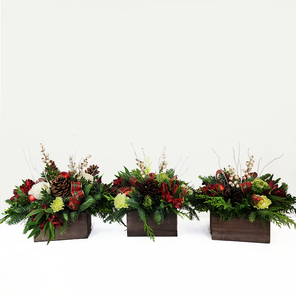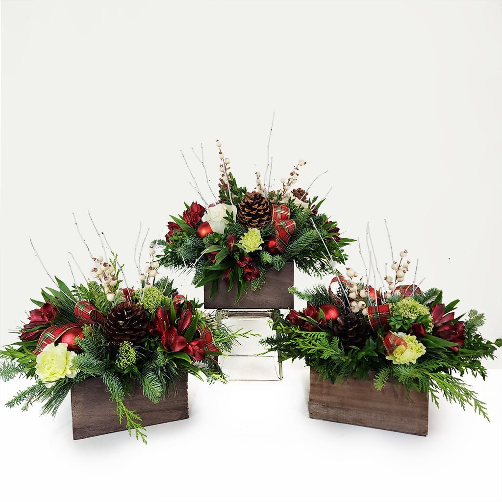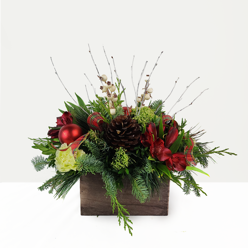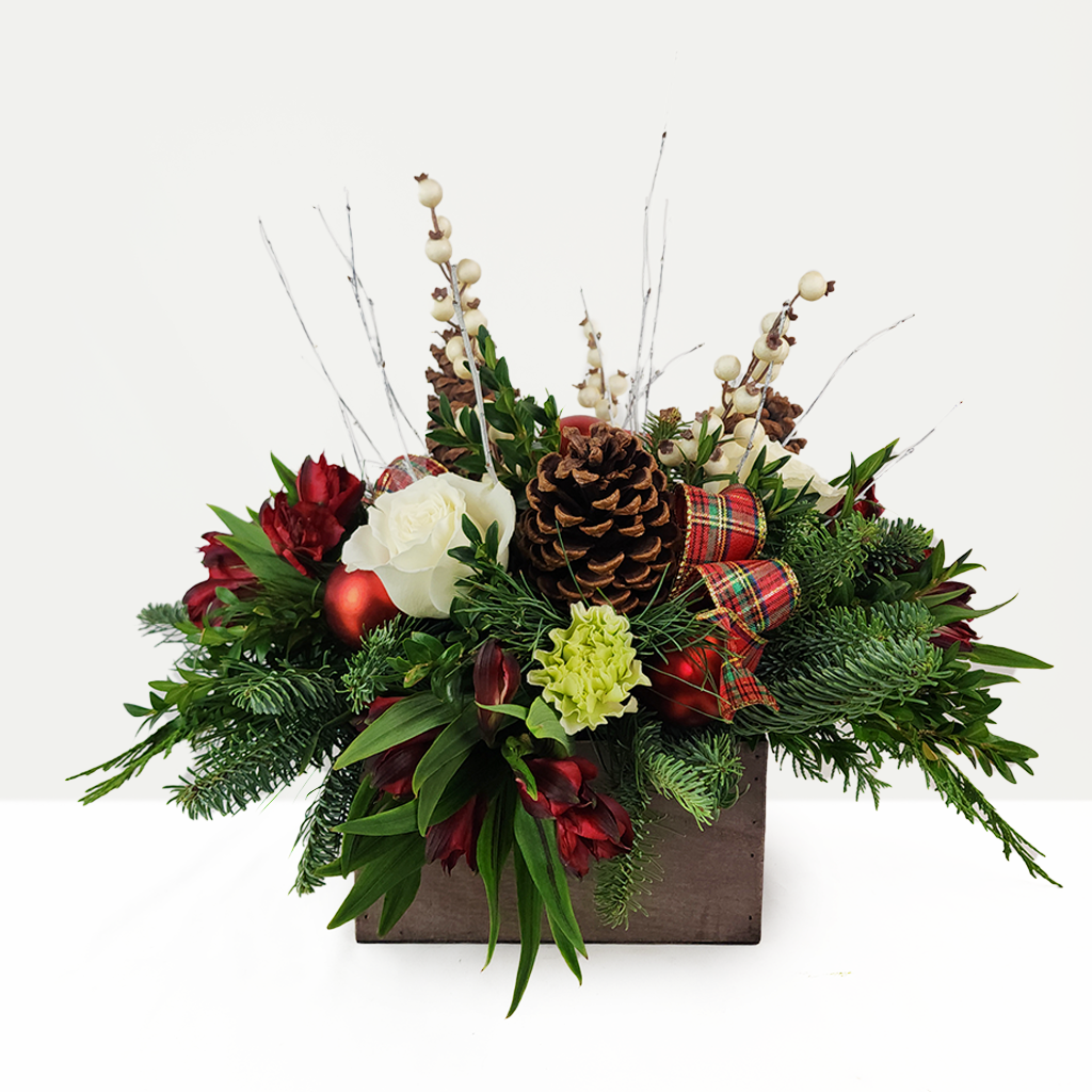 A holiday arrangement in a rustic wooden rectangle container features elegant white roses paired with vibrant red blooms for a striking seasonal contrast. Pinecones, red accents, and fresh holiday greens add natural texture and festive warmth, creating a charming and timeless winter display.