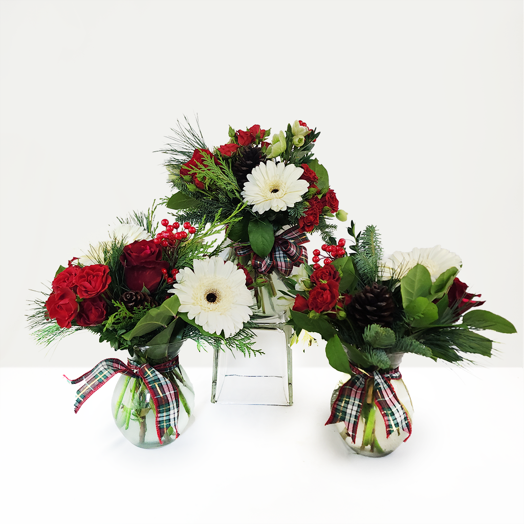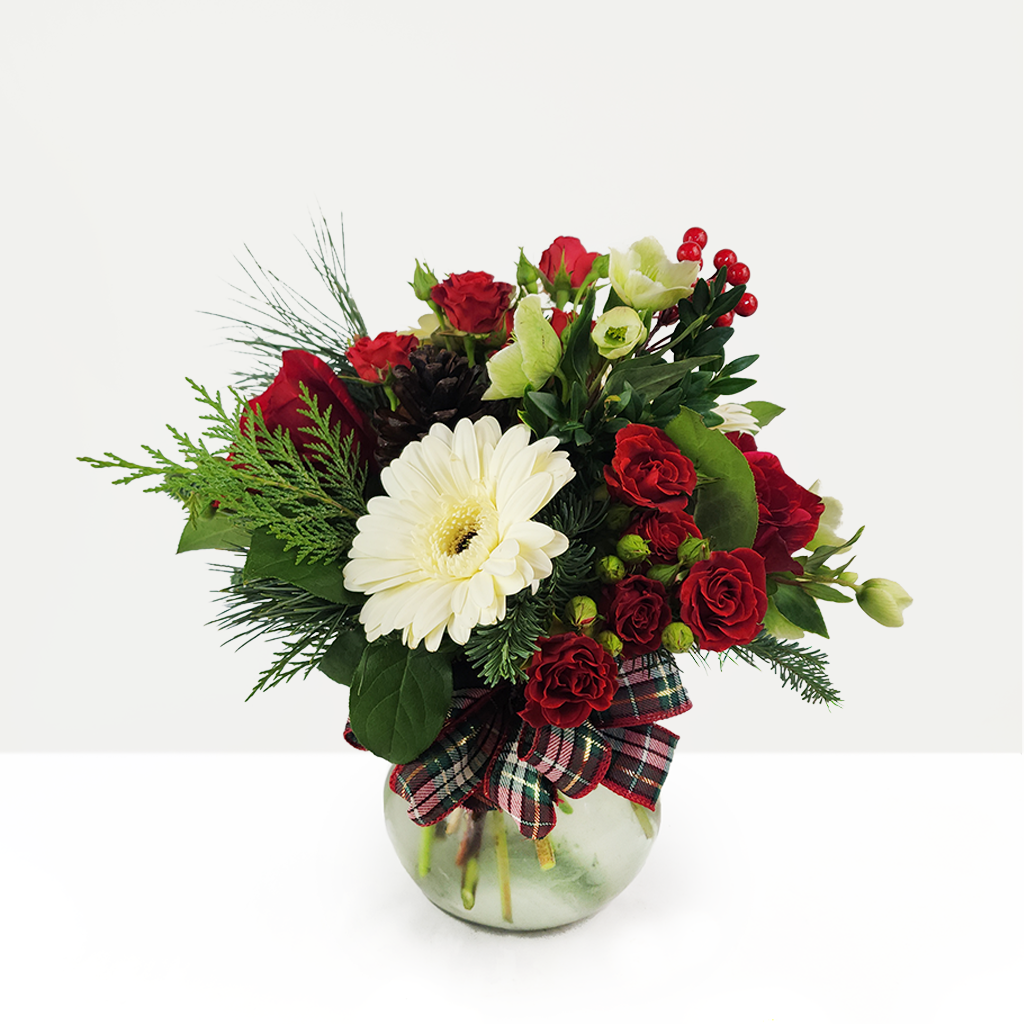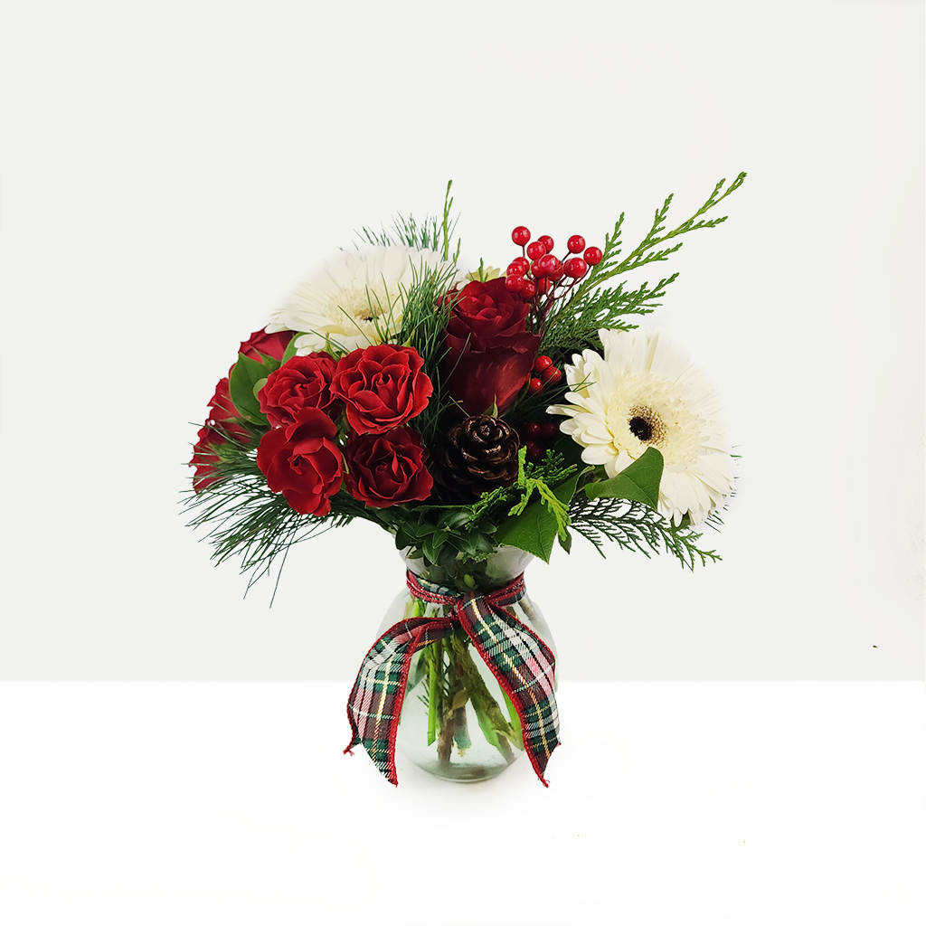 A compact holiday arrangement in a glass vase featuring red mini roses, gerbera daisies, and classic roses creates a vibrant, cheerful focal point. Lush greens, pinecones, and a festive ribbon add rich texture and seasonal charm, bringing together a warm and joyful holiday look.