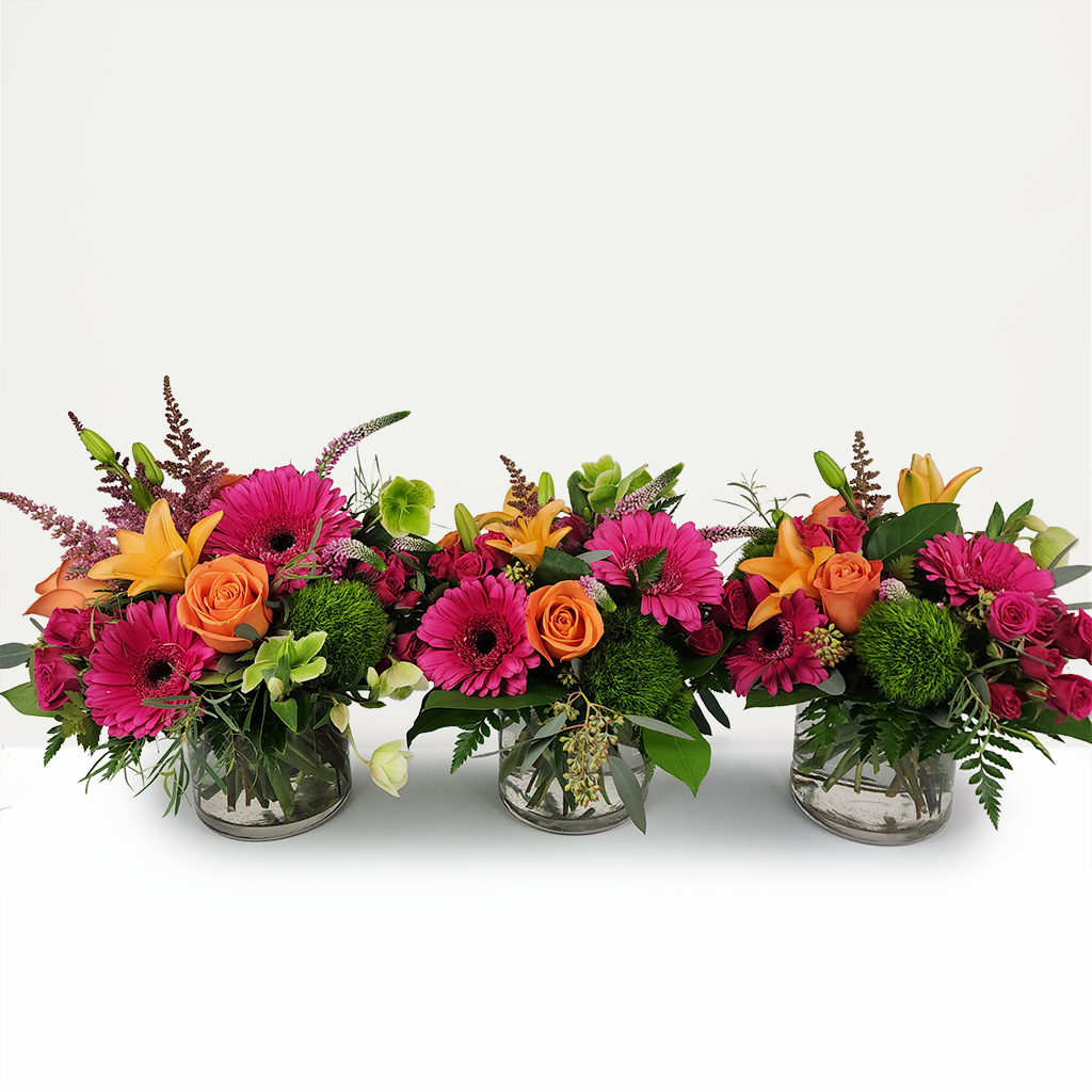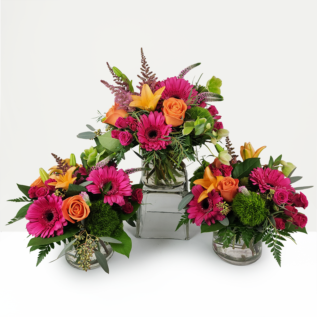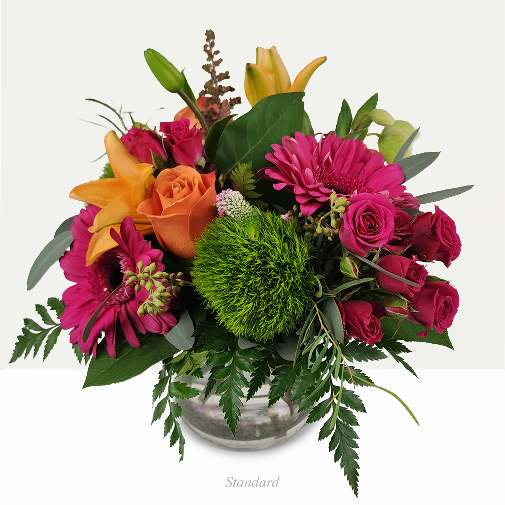 Warm and vibrant, The Vista captures the colors of a spring sunset with glowing oranges, soft pinks, and fresh greens. Featuring roses, cheerful gerbera daisies, and spray roses surrounded by seasonal blooms and lush fillers, it’s a radiant arrangement that brings instant brightness to any space.