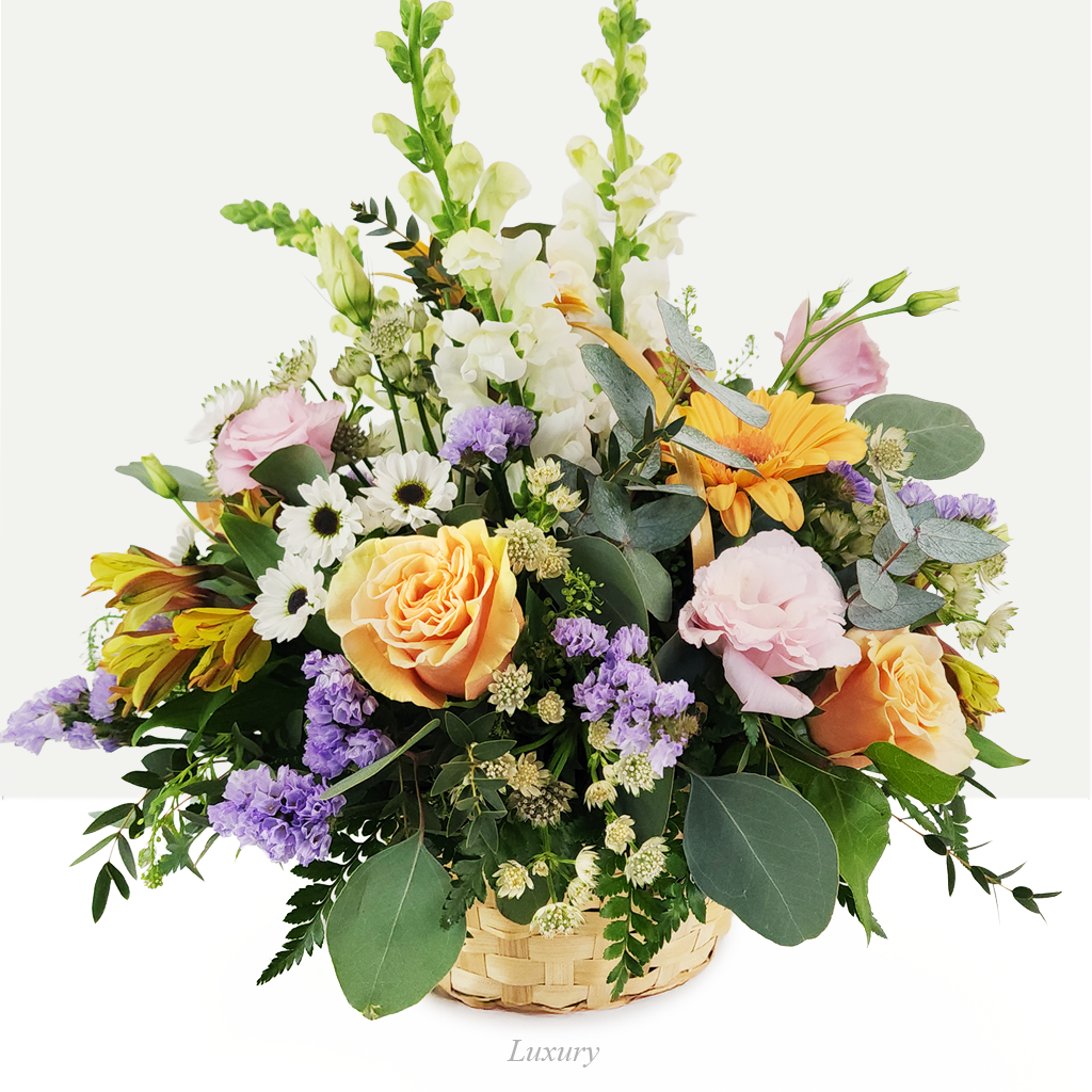 Bright, cheerful, and full of spring charm, The Woodhaven arrangement is designed to delight. Nestled in a rustic basket, it features a vibrant mix of seasonal blooms, including lush roses, elegant snapdragons, soft filler flowers, and a joyful array of colors. Bursting with life and warmth, The Woodhaven is a perfect way to celebrate with a touch of countryside beauty.